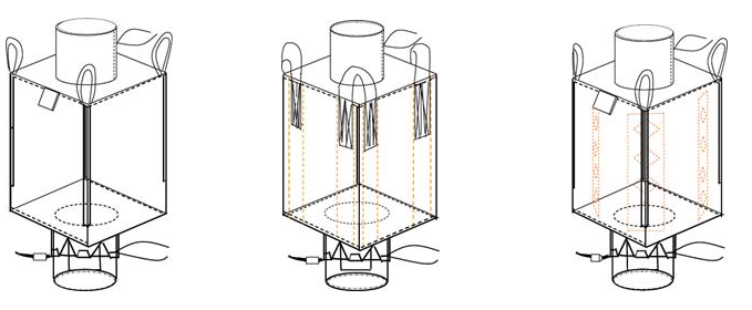 一,集裝袋的結構樣式主要有3種,從左到右依次為U型片設計、圓筒型設計、隔板型設計。